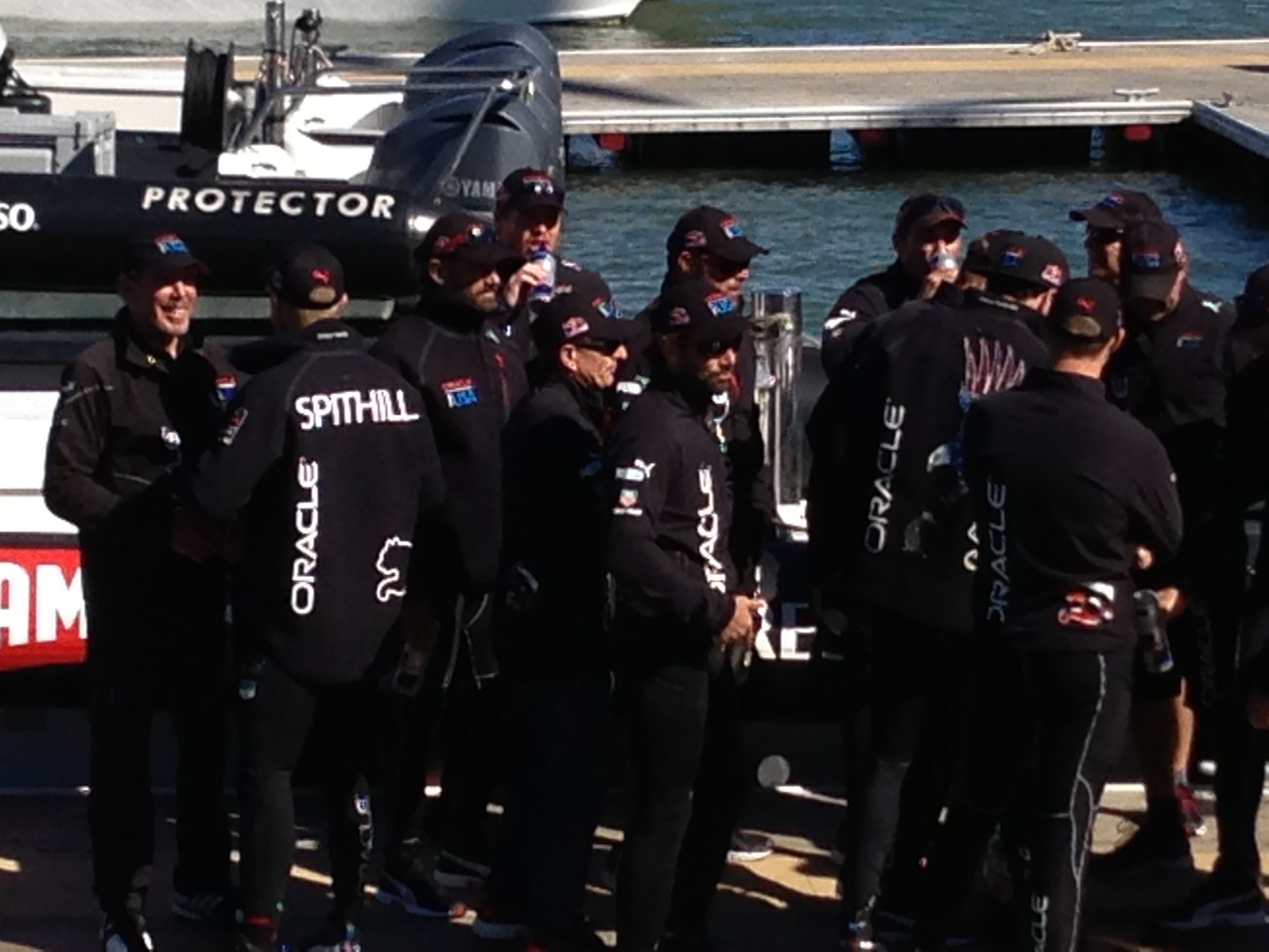 Above: Jimmy Spithill, skipper of Oracle USA, shares a smile of satisfaction with team owner Larry E. on the Pier 27 dock as they await the award ceremony.