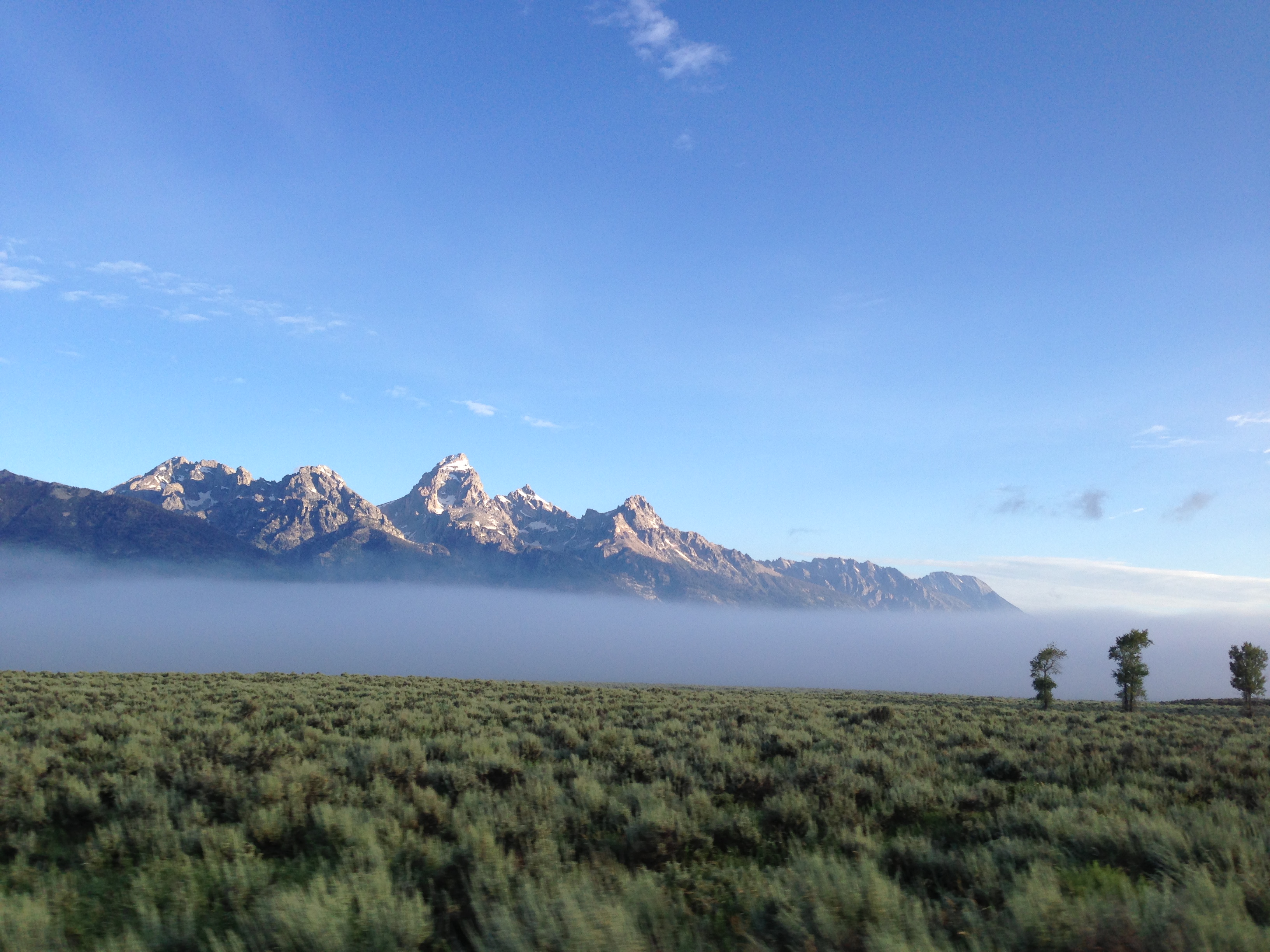 The Grand on a July morning, beyond a lifting fog, from a vehicle about 8 miles away heading south to the airport.